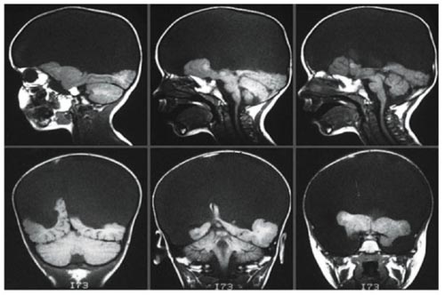 .jpg) 무뇌수두증 환자의 MRI사진. 대뇌 부분이 없어 검은색으로 나타난다